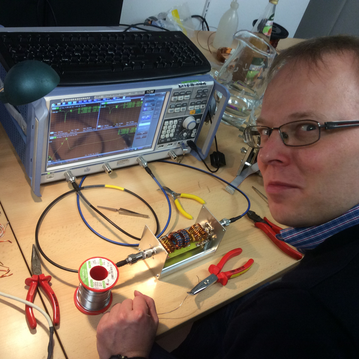 Am Abend des dritten Tages stieß Simon, DJ4MZ, zu uns, der ein professionelles Messmittel aus seinem QRL mitbrachte. Damit konnten Reflexionsdämpfung und der Durchlassbereich der aufgebauten Filter gleichzeitig dargestellt werden und der Abgleich an diesem Abend und am nächsten Tag gelang prima. Da und dort waren noch ein paar Windungen zu entfernen – insgesamt war die „Ersttrefferquote“ aber schon recht hoch.