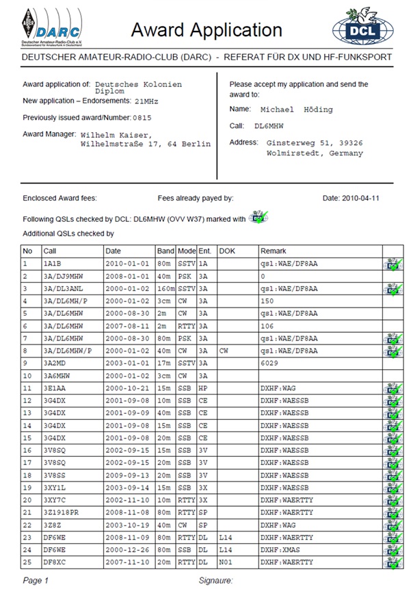 Es war auch möglich, mit dem „allgemeinen“ GCR-Antrag beliebige Diplome mit DCL-QSLs zu beantragen. Eine Möglichkeit, die nach wie vor genutzt wird.