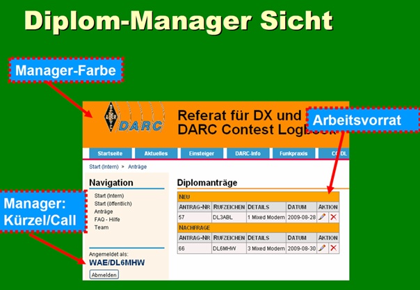 Idee und Umsetzung waren noch sehr traditionell. Aus der Datenbank der vorhandenen Contest-QSOs wurde für ein ausgewähltes Diplom ein vorausgefüllter Diplomantrag generiert. Dieser enthielt die geprüften Punkte aus den WAE-Contesten. Der Vorteil lag darin, dass man für viele einfache QSO-Punkte wie EA oder IT9 keine QSL heraussuchen und zur Prüfung vorlegen musste. Die vorausgefüllte Liste sollte dann ausgedruckt und per Hand ergänzt werden. Dadurch konnten wie üblich eher seltene Länder mit QSL-Karten nachgewiesen werden, die dann vom Diplommanager geprüft wurden. Vor allem Hajo, der damals das WAE-Diplom übernahm, war begeistert, machte Verbesserungsvorschläge und Werbung, z.B. in der CQDL (Quelle: CQDL2003) bzw. im BCC-Rundbrief zur HAM Radio 2004.