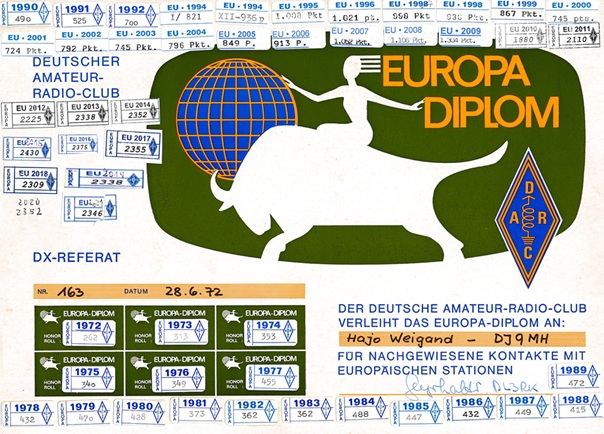 Etwas problematisch bzgl. WAE-Diplom war, dass wir im WAEDC nur DX-Stationen arbeiten dürfen (Ausnahme RTTY) und deshalb der WAE-Antrag eher für internationale Antragsteller attraktiv war. Das änderte sich aber mit der Hinzunahme der WAG-Daten ab 1998, die Klaus, DL1DTL auf einer CD bereitstellte. Man konnte als aktiver Contester mit dem DCL die Grundstufe des WAE ohne zusätzliche QSLs erwerben. Für das EUDXD und das Europa-Diplom gab es aber auch für DLs viele Punkte. Hajo als aktiver Europa-Diplom Sammler hat es durch DCL-QSOs oft geschafft, die Spitze der Jahreswertung zu erklimmen.