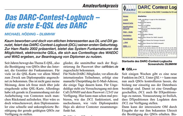 Inzwischen war die ARRL aktiv geworden und hatte etwa zwei Jahre nach der Ankündigung das LOTW an den Start gebracht. Bernd, DF3CB, schrieb einen Artikel für den FUNKAMATEUR. Um zu zeigen, dass auch der DARC ein ähnliches schon seit über einem Jahr laufendes System bereitstellt, konnte ich neben Bernds Artikel einen DCL-Artikel platzieren (Quelle: DL6MHW2003).